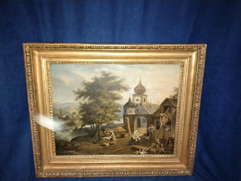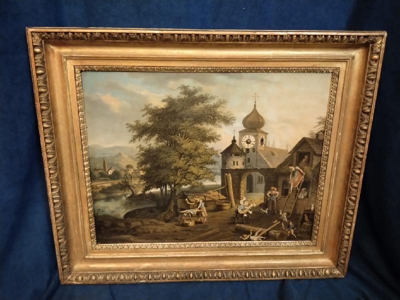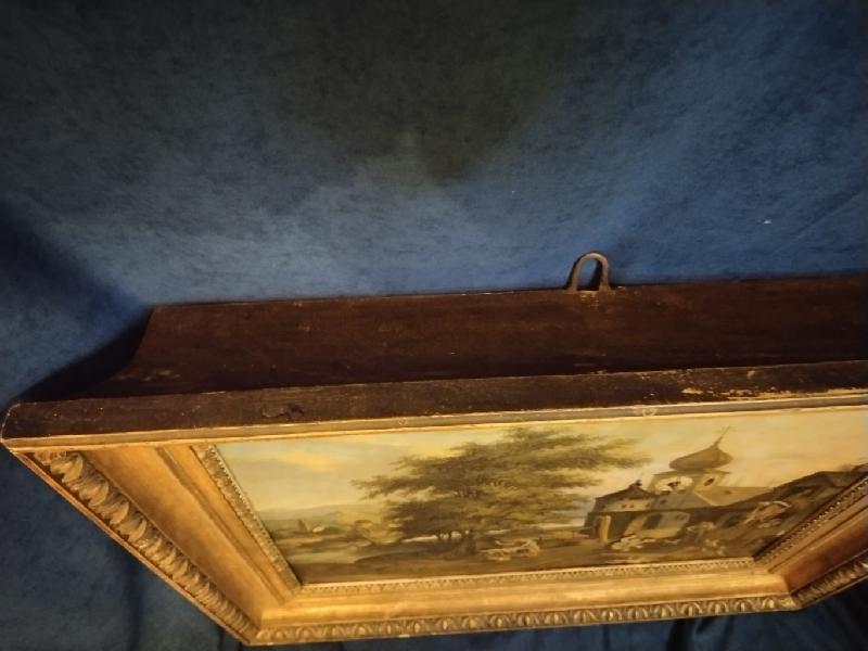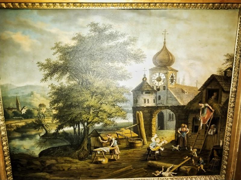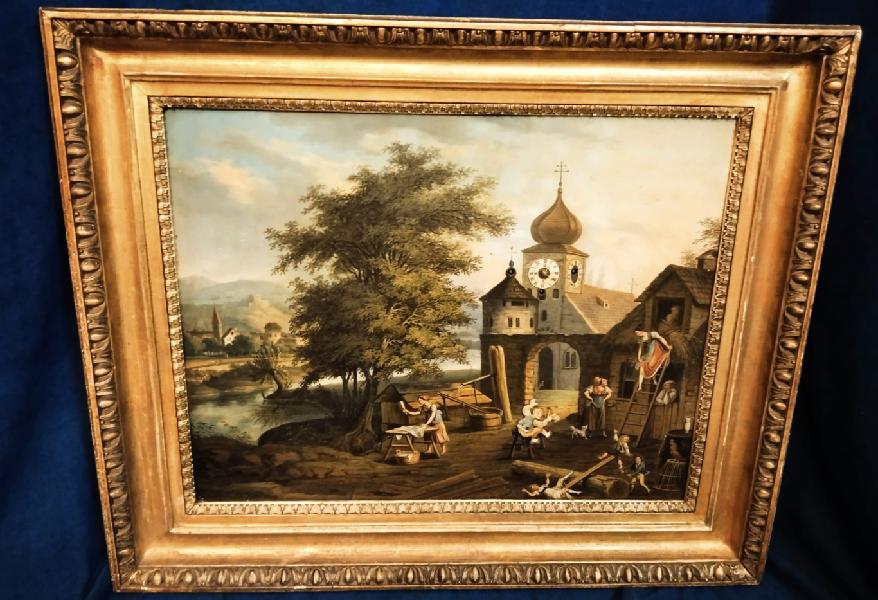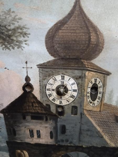 Starožitné, obrazové, čtvrťové hodiny se špindlovým krokem a pohybem v obraze. ( pohyb – viz. video níže )